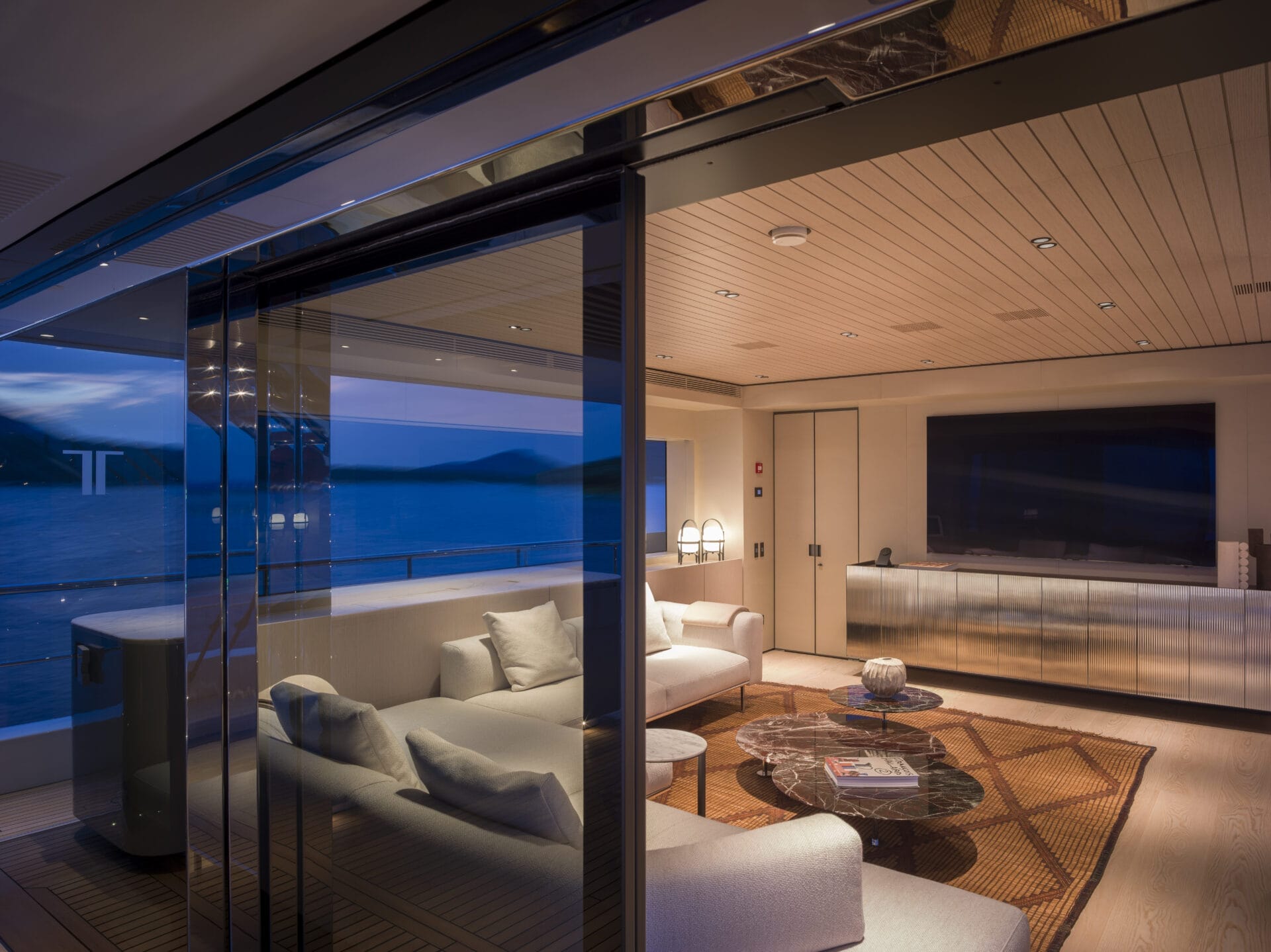 The sky lounge is a standout feature and fitted with a Samsung 85″ 8K Neo QLED for cinema-level viewing. Behind the scenes, Crestron NVX handles 4K60 HDR content distribution over a standard 1G network, ensuring flawless video throughout the yacht. Sonos integration and Apple AirPlay allow effortless streaming from personal devices.